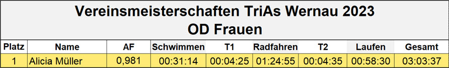 Überhaupt erst zum zweiten Mal wurde der Wanderpokal in der olympischen Distanz der Frauen vergeben. Siegerin wurde Alicia Müller, die zum ersten Mal eine olympische Distanz bestritt. Dass sie die einzige Teilnehmerin war, schmälert ihr großartige Leistung keineswegs.